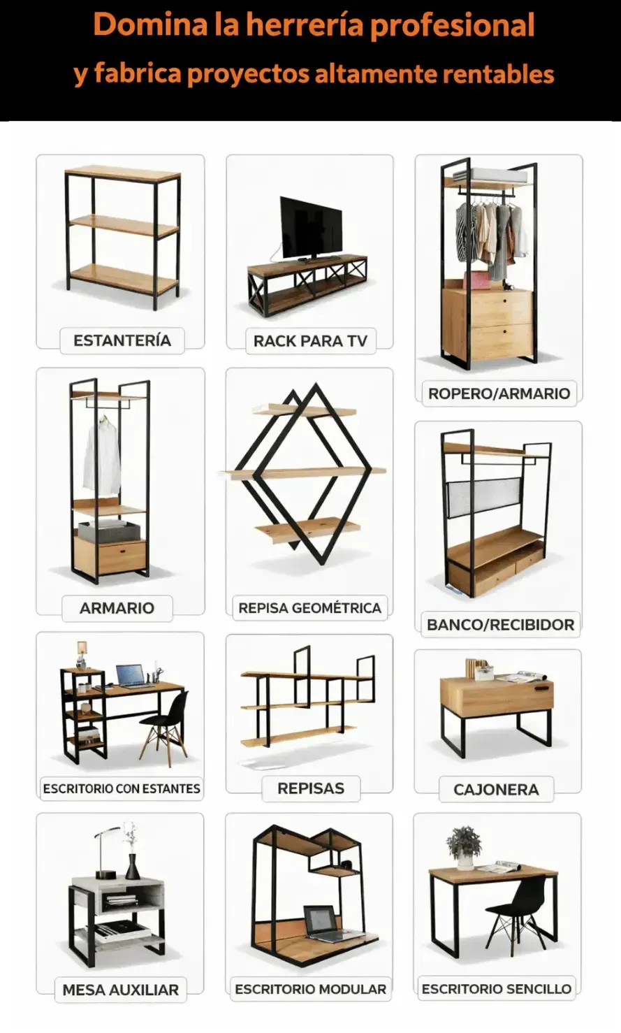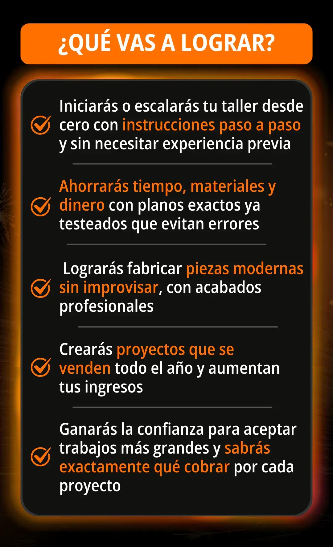 Incluye más de 600 planos y diseños listos para fabricar, guía de medidas exactas, proyectos rentables y los bonus adicionales que complementan tu formación para que trabajes con método profesional.